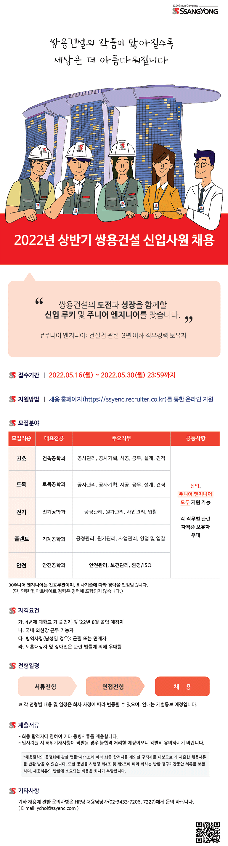 해외건설 명가 쌍용건설이 2022년도 상반기 신입사원 채용을 진행한다.