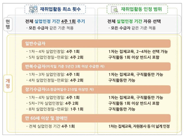 현재 모든 수급자에게 수급기간 동안 재취업활동 횟수와 범위를 동일하게 적용하고 있으나, 앞으로는 반복.장기수급자는 요건을 강화하고, 만 60세 이상과 장애인 수급자에 대해서는 완화된 기준을 적용한다.