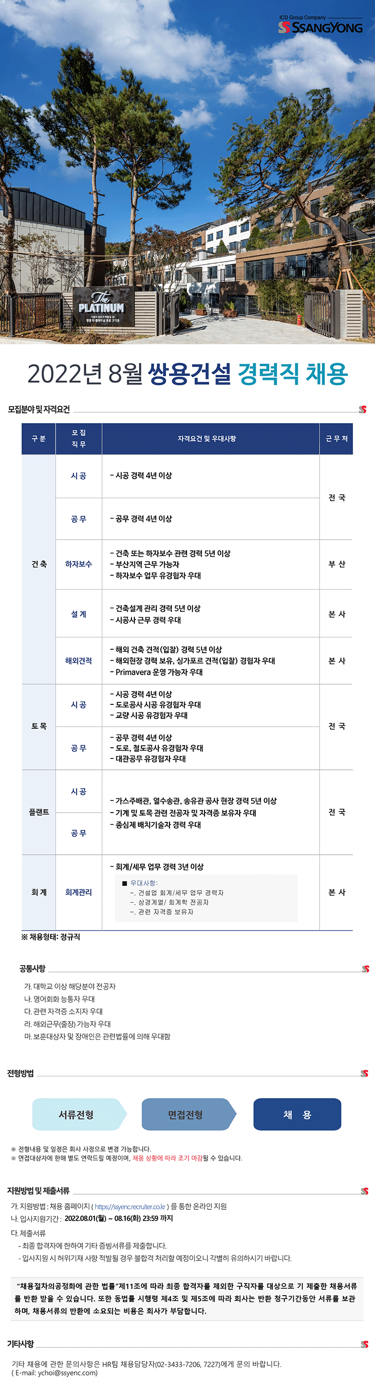 쌍용건설이 2022년 8월 경력직 채용을 진행한다고 건설워커가 밝혔다.