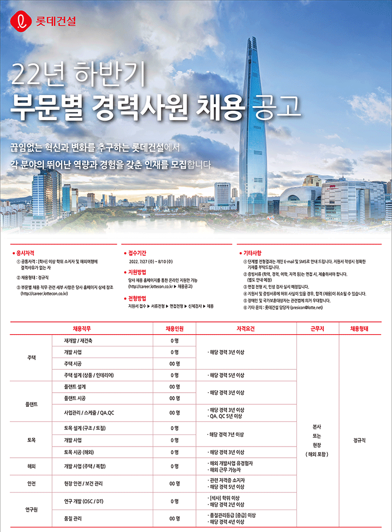 롯데건설, 2022년 하반기 부문별 경력사원 채용…서류접수 10일까지 [건설워커 채용속보 2022-08-05] 롯데...