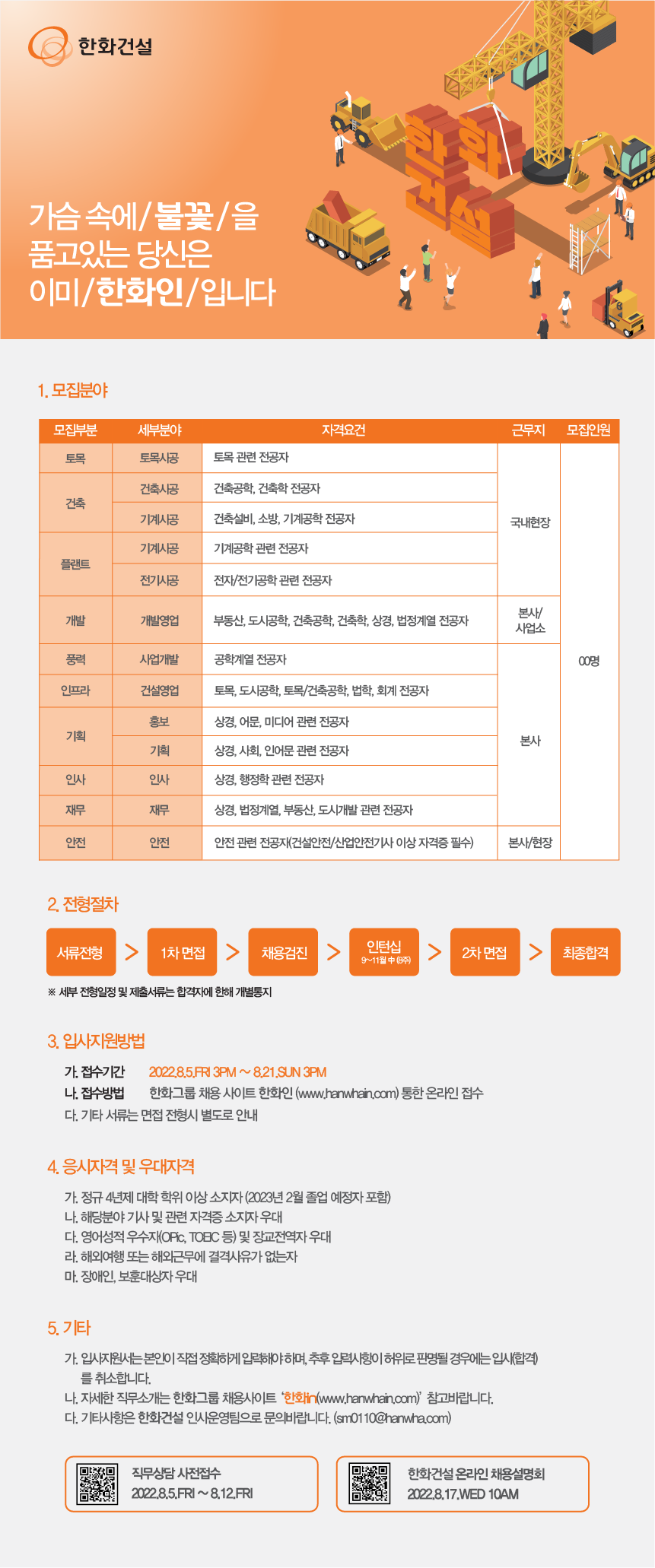 한화건설이 하반기 채용연계형 대졸신입(인턴) 채용을 진행한다. 모집부분은 토목, 건축, 플랜트, 개발, 풍력, 인프라, 기획, 인사, 재무, 안전이며 21일까지 한화그룹 채용사이트인 한화인에서 입사지원하면 된다. 응시자격은 △정규 4년제 대학 학위 이상 소지자(2023년 2월 졸업예정자 포함) △분야별 관련 전공자 등이며 우대조건은 △해당분야 기사 및 관련 자격증 소지자 우대 △영어성적 우수자(OPic, TOEIC 등) 및 장교전역자 우대 등이다.