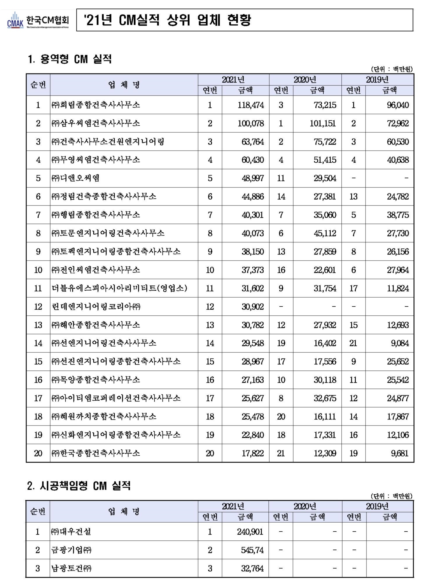 한국CM협회, 2022년도 건설사업관리(CM) 능력평가 공시