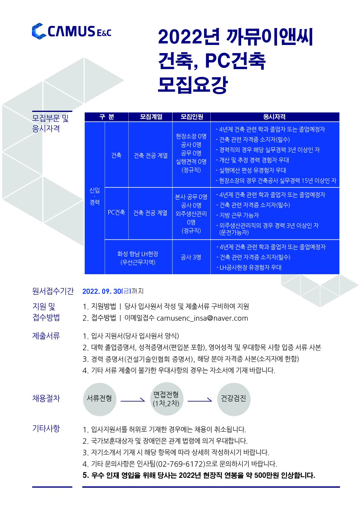 까뮤이앤씨 채용, 건축·PC건축 신입/경력사원, 현장직 연봉 500만원 인상