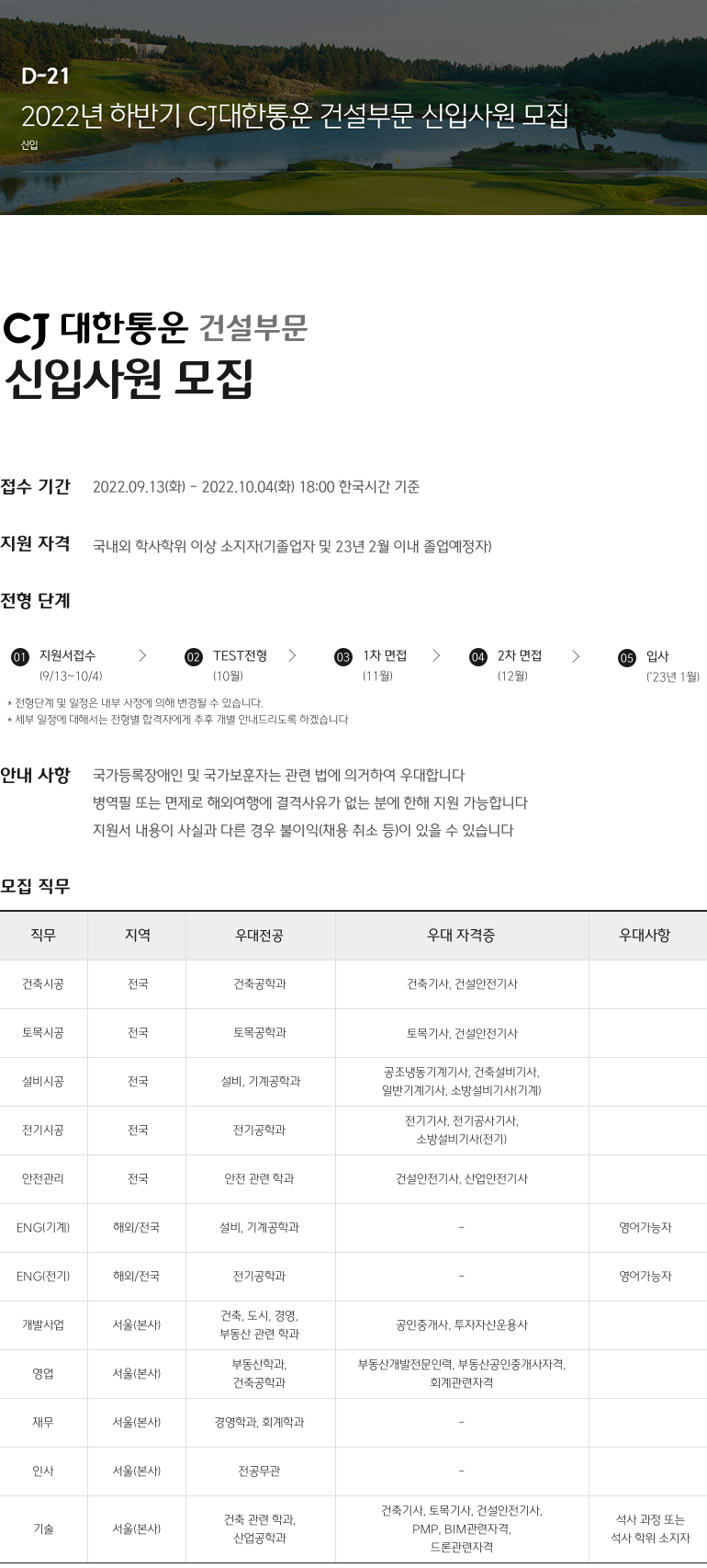 CJ대한통운 건설부문이 신입사원을 모집한다.