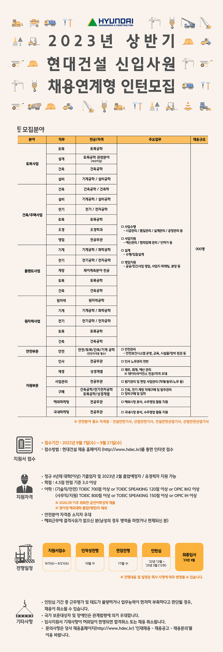 현대건설은 2023년 상반기 신입사원 채용연계형 인턴을 모집한다. 모집분야는 토목사업, 건축/주택사업, 플랜트사업, 원자력사업, 안전부문, 지원부문 등이며 21일까지 회사 채용 홈페이지에서 입사지원하면 된다.
