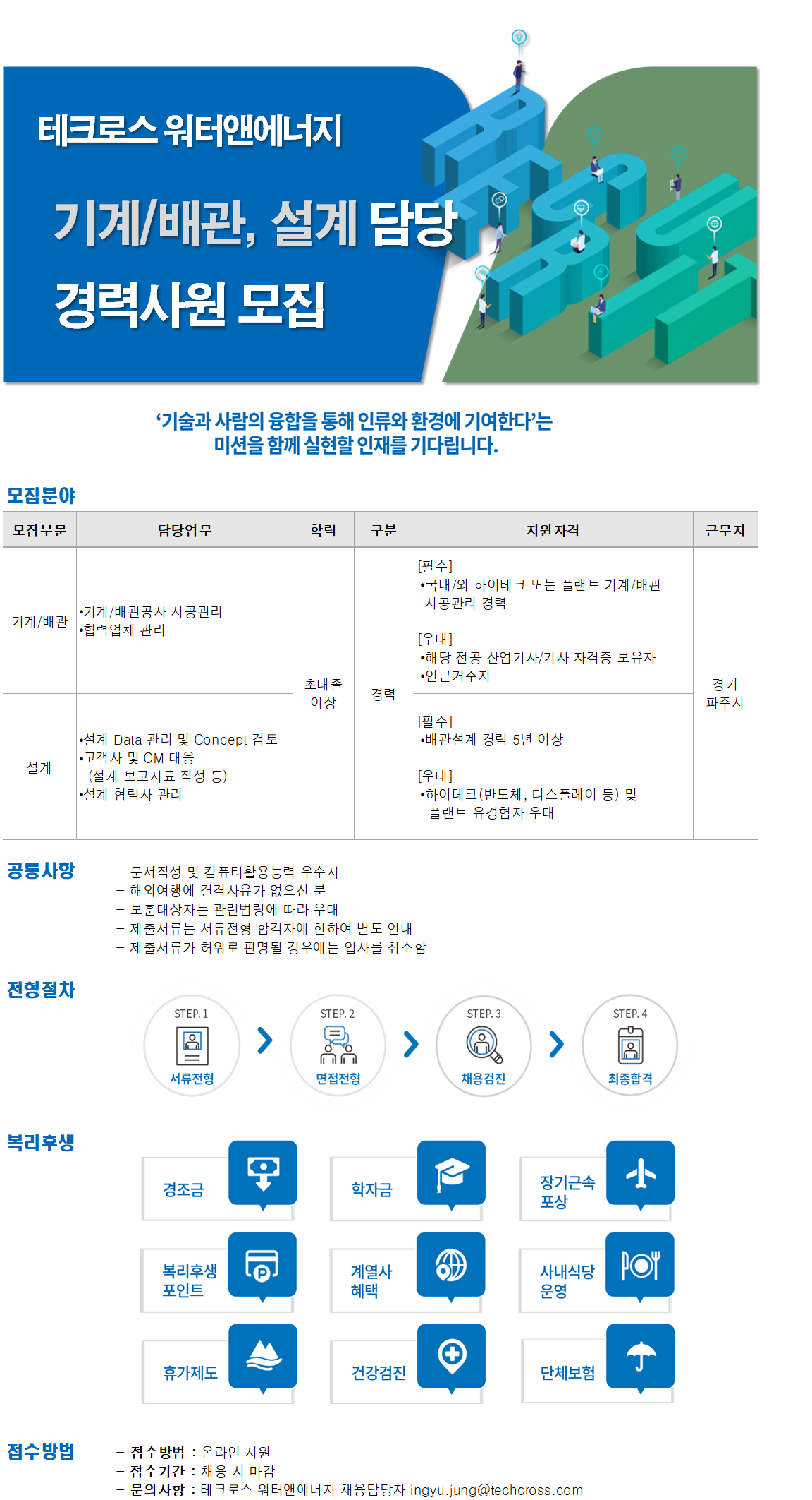 (주)테크로스워터앤에너지 LGD 파주현장 기계/배관, 설계 담당 경력사원 모집