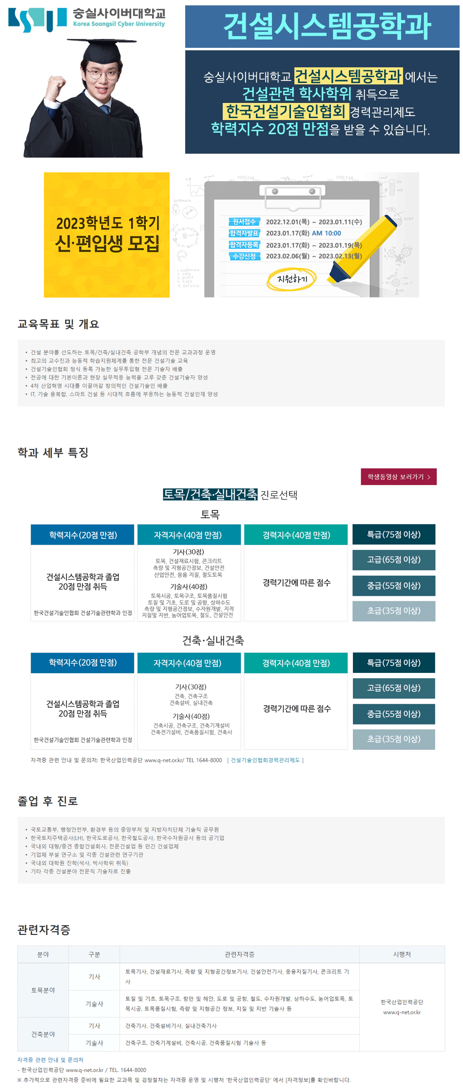 숭실사이버대학교 건설시스템공학과, 2023학년도 1학기 신·편입생 모집…실무형 건설기술인재