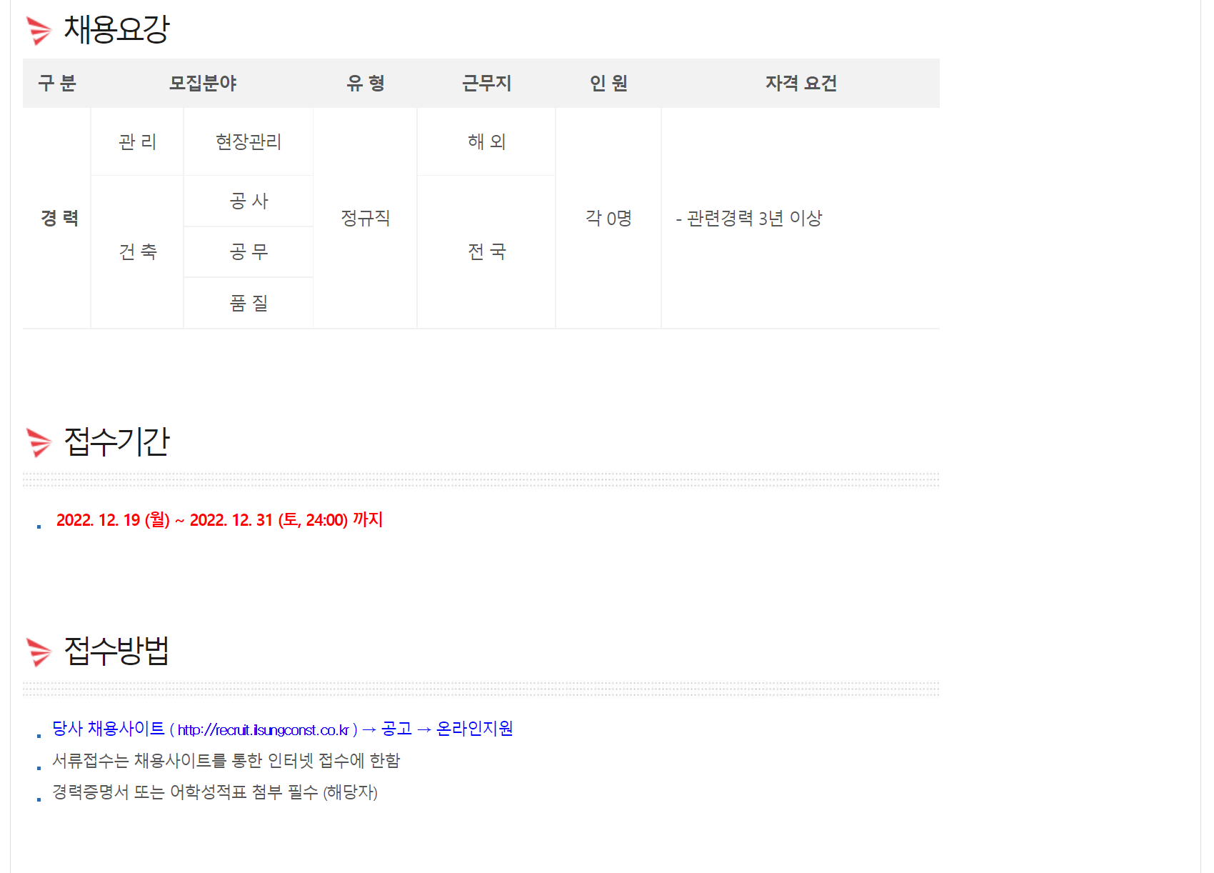 일성건설(주) 2022년 12월 경력직(건축직/해외현장관리) 채용 공고