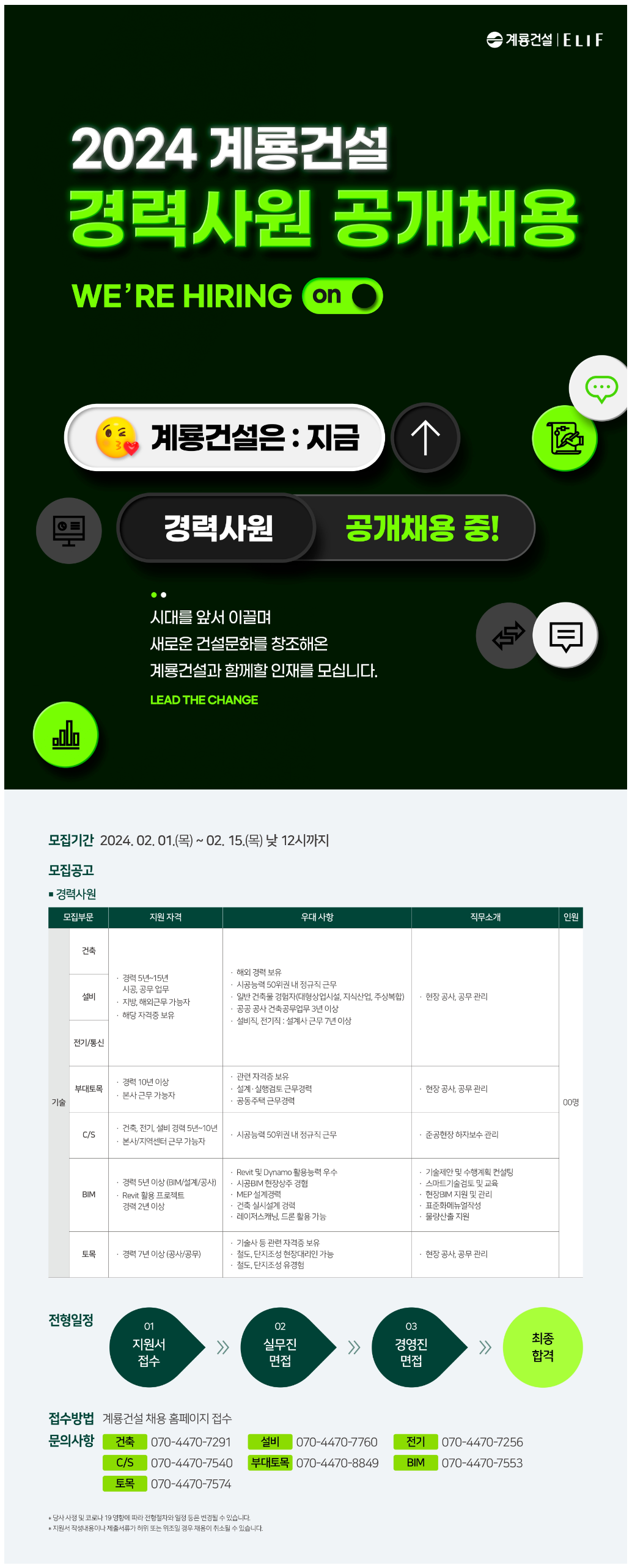 경력사원 모집부문은 건축, 설비, 전기·통신, 부대토목, C/S, BIM, 토목 등으로 나뉘며 지원 자격은 ▲직무별 경력충족자 ▲관련 자격증 보유자 필수(건축, 설비, 전기·통신) 또는 우대(기타 부문)다.