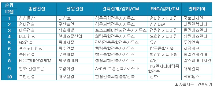 12월 건설회사 인기순위: 서희·금호·동부·대방 상승↑, DL·코오롱·신세계건설 하락↓
