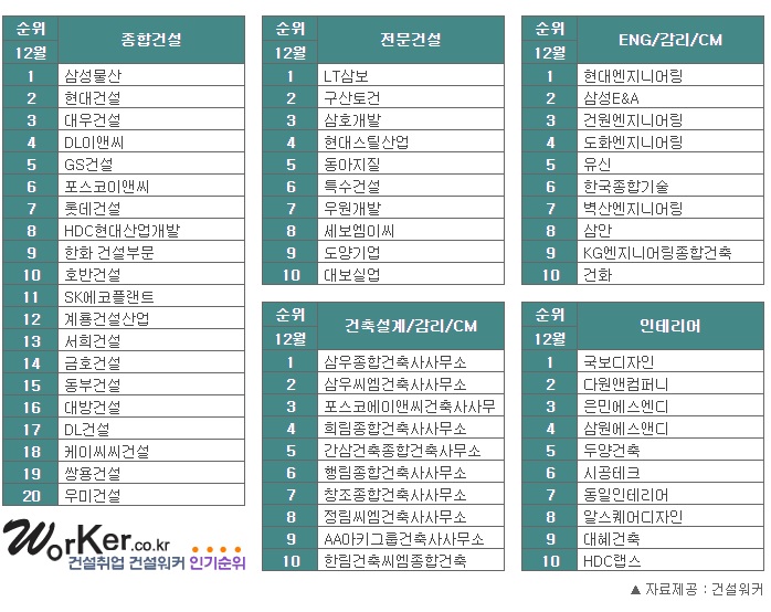 건설워커 12월 랭킹 발표: 삼성물산 86개월 연속 1위 건설워커가 2024년 12월 건설사 취업인기순위를 발표...