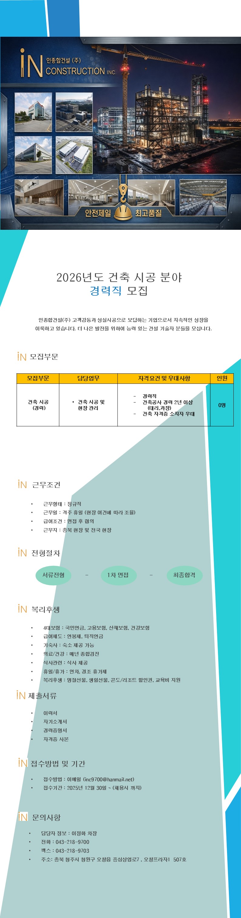 [인종합건설(주)] 건축 시공 분야 경력직 모집(충북/청주) (마감일 : 채용시) - 건설취업 건설워커