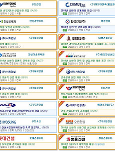 "건설워커에 없다면 대한민국 건설회사가 아닙니다." 4월 첫째주에는 어떤 건설회사 채용정보가 눈에 띌까요? 건영, 까뮤이앤씨, 일성건설, 한신공영, 서희건설, 대방건설, 건설기술교육원, 동양건설산업, 두진건설, 에이스건설, 효성, 호반건설, 롯데건설, 쌍용건설, 건원엔지니어링, 창성건설, 서한, 새천년종합건설... 건설구인시장이 어렵다지만, 건설워커에는 매일 500건 이상의 건설회사 채용정보가 신규로 등록되고 있어요. 채용정보를 보시다가 궁금한 점이 있으면 언제든지, 잡(JOB)소리 & 기업정보 게시판에 올려보시기 바랍니다. 네이버 지식iN과 같은 소통의 공간입니다. 삼성물산(주) / 현대건설(주) / (주)대우건설 / 대림산업(주) / ㈜포스코건설 GS건설(주) / 현대엔지니어링(주) / 현대산업개발(..